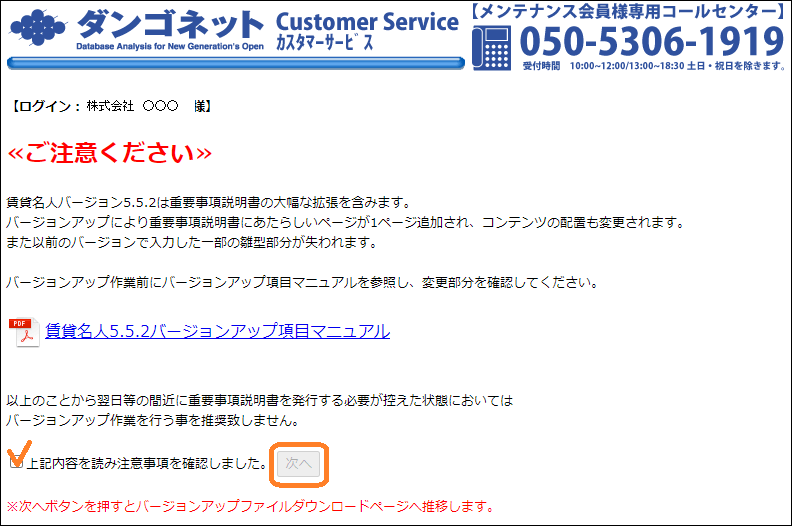※次へボタンを押すとバージョンアップファイルダウンロードページへ推移します。 」