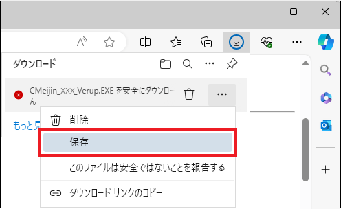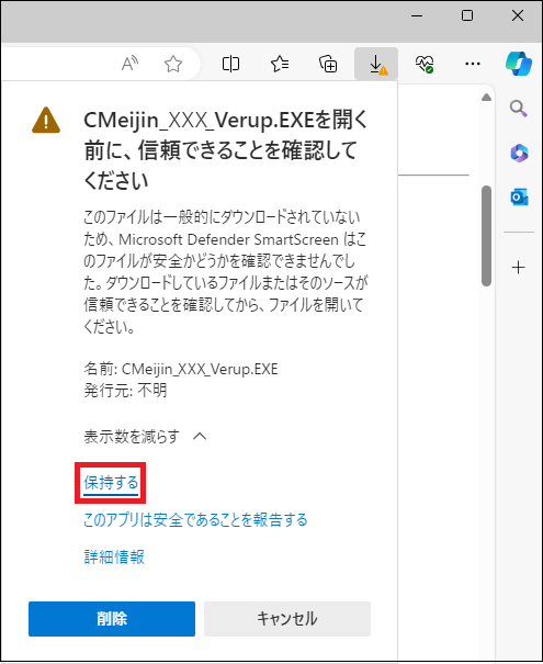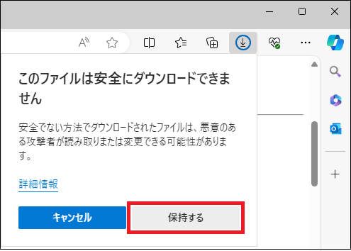 ブラウザ「Microsoft Edge(エッジ)」で発行元不明の実行ファイルをインターネットからダウンロードし実行すると、悪意あるプログラムが不意に実行されることを防止するためのセキュリティダイアログが現れます。