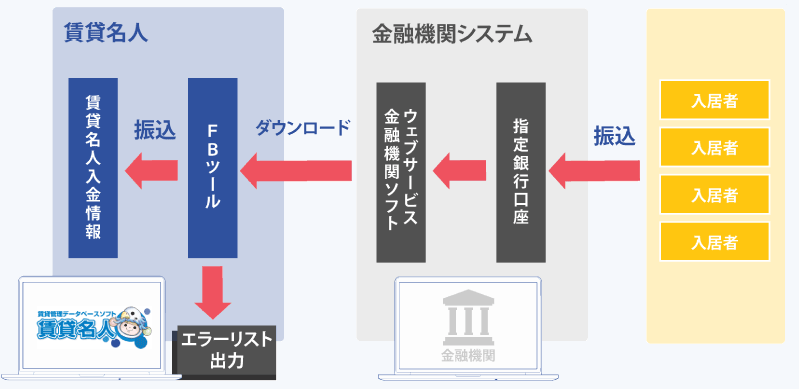 金融機関が提供する「振り込みファイル」を賃貸名人で取り込み、毎月の家賃管理を”自動化”します。