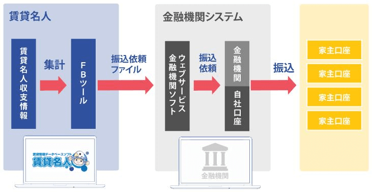 賃貸名人で作成した「収支ファイル」を元に、金融機関に送信する家主口座への「振込依頼ファイル」を作成し、毎月の家主への送金を支援します。