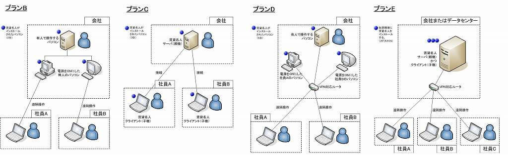 弊社サービス以外でテレワークを実現するには、下記プランB~Eの4つが活用できます。(お客様が弊社以外の外部に管理を移管する場合を含む)