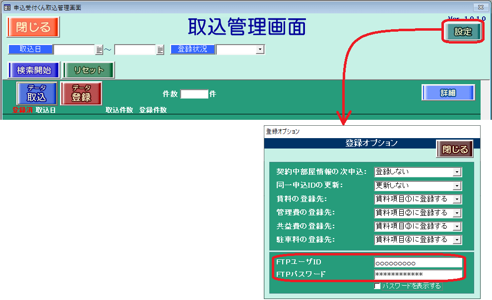 取込管理画面の[設定]ボタン内の「FTP ユーザ ID」「FTP パスワード」欄に、イタンジ社が発行する ID、PW を入力します。