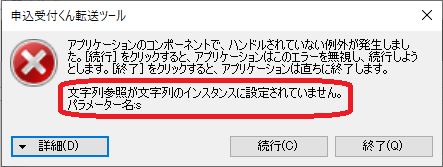 『アプリケーションのコンポーネントで、ハンドルされていない例外が発生しました。