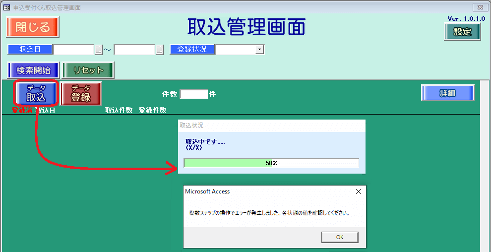 (症状例)上記エラーが出た後、取込管理画面の取込件数が表示される。
