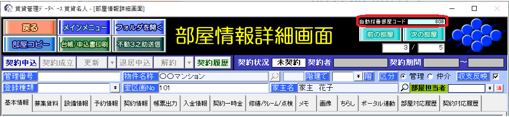 「申込受付くん取込ツール」は、イタンジ社「物確システム」の「部屋ID」と、弊社「賃貸名人」の部屋情報詳細画面「自動採番部屋コード」の一致で付け合わせをします。