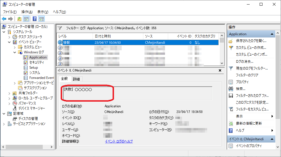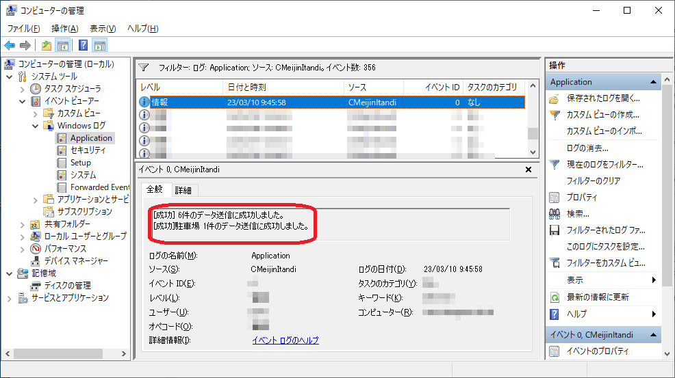 「コンピュータの管理」の「システムツール」-「イベントビューアー」-「Windows ログ」-「Application」で、物件データ(部屋データ)の送信が[成功][失敗]しているか確認することができます。Windows スタートの上で右クリックし、「コンピュータの管理」を起動します。