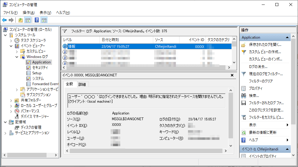 「コンピュータの管理」の「システムツール」-「イベントビューアー」-「Windows ログ」-「Application」は、物件データ(部屋データ)の送信が[成功][失敗]しているか確認することができます。