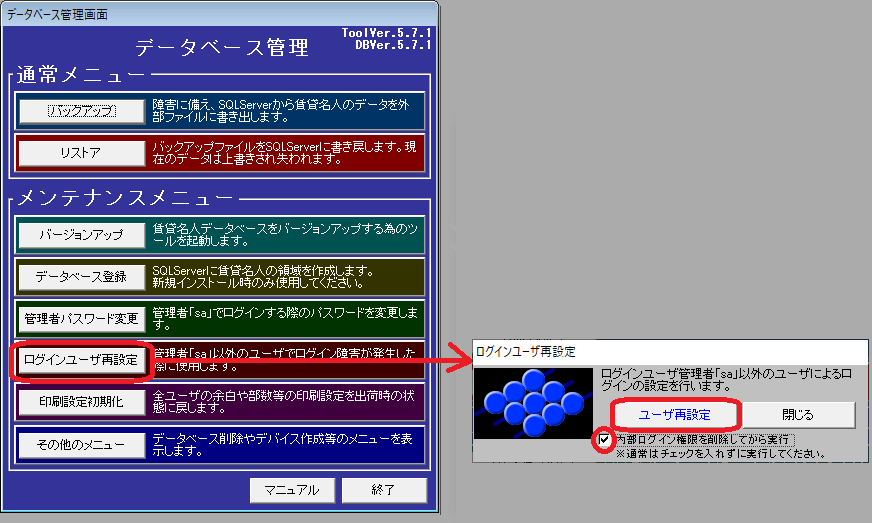 ①データベース管理の[ログインユーザ再設定]ボタンをクリックします。