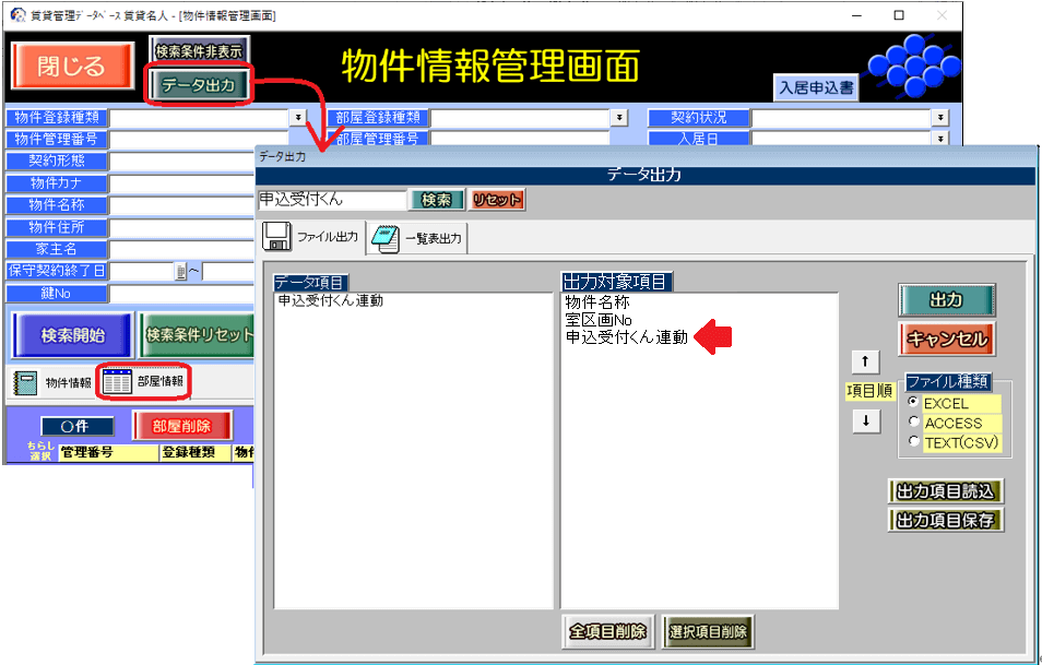 ②[部屋情報]タブを選択し、[データ出力]ボタンをクリックします。