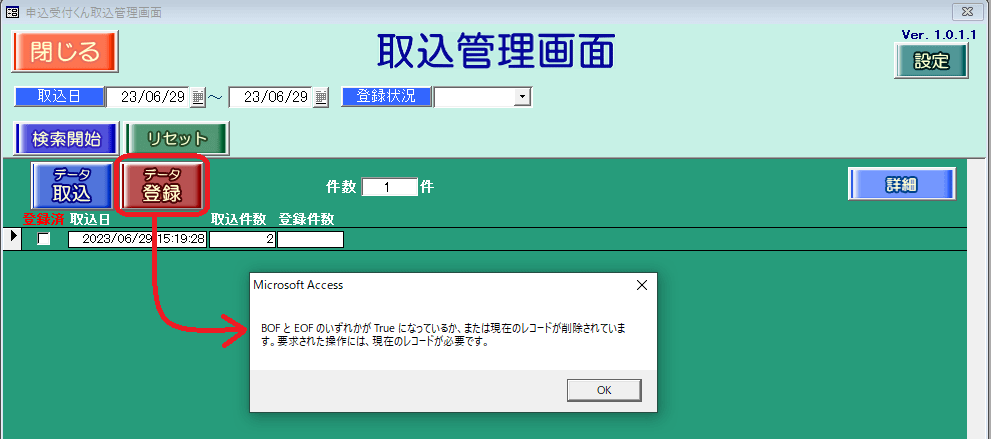 取込管理画面の[データ登録]ボタンを実行したら、以下のメッセージが表示されます。 [BOFとEOFのいずれかがTrueになっているか、または現在のレコードが削除されています。要求された操作には、現在のレコードが必要です。]