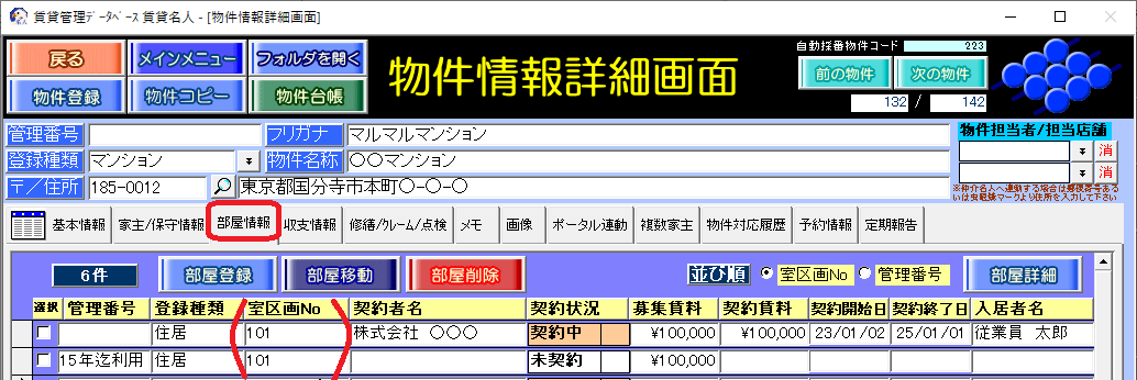 例2.同じ物件名で複数の物件登録していて、それぞれ同じ号室で部屋登録がある。
