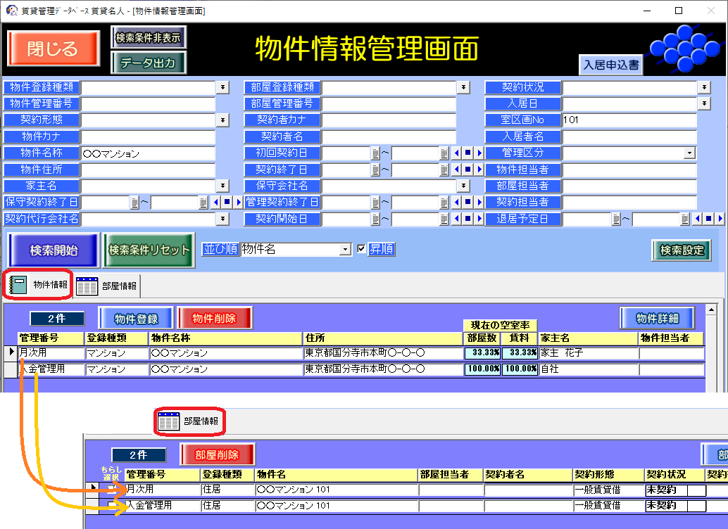 サブリース(一括借上)物件で、月次報告書用の物件と、入金管理用の物件とで分けてデータ登録した。