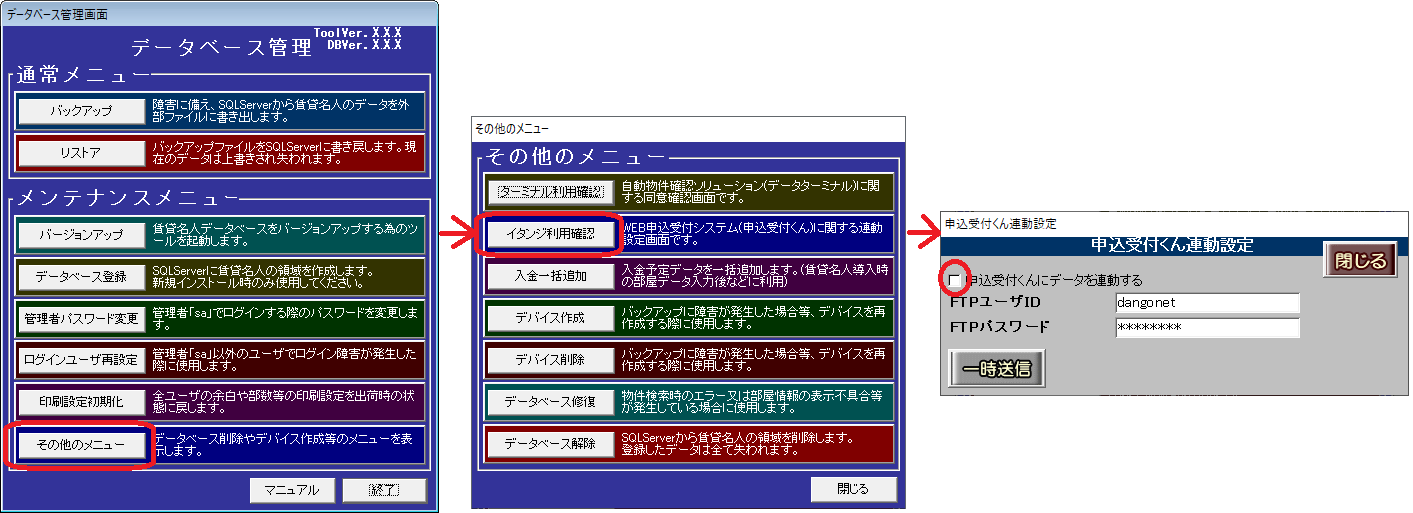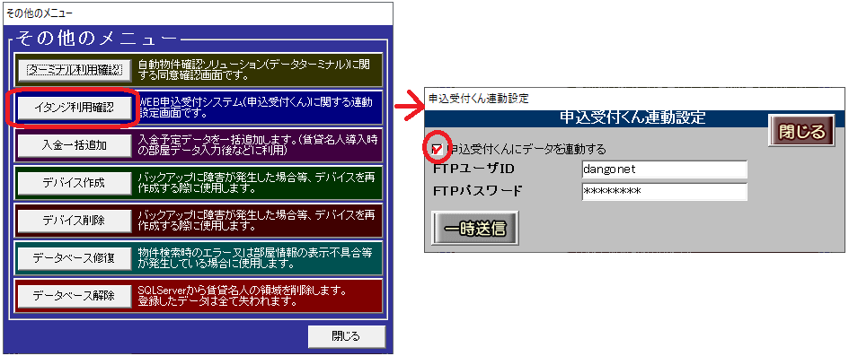 ②-3.再度[イタンジ利用確認]ボタンを開き、[申込受付くんにデータ連動する]チェックを付与し、データベース管理を終了します。