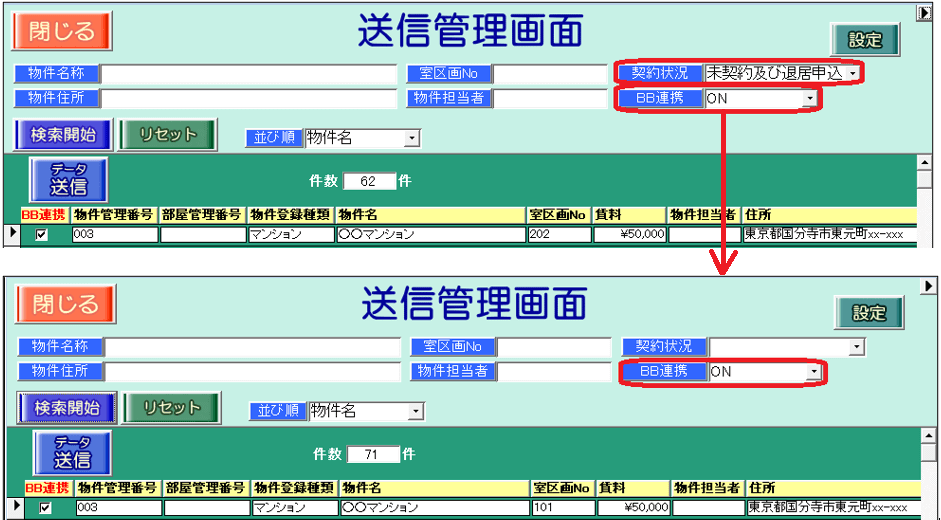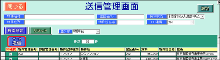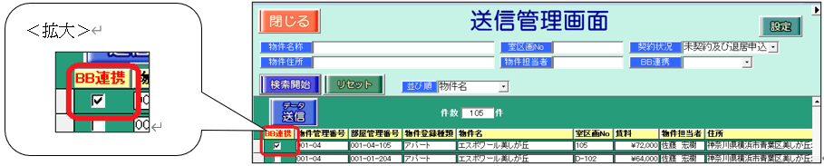 送信管理画面を展開時、2つの検索条件「契約状況:未契約及び退居申込」「BB連携:ON」で画面表示をします。以下のいずれかの操作で、送信対象の部屋を確認します。