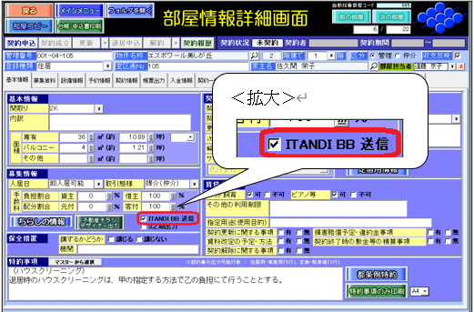 送信管理画面の[BB連携]チェックは、賃貸名人の部屋情報詳細画面[基本情報]タブ[ITANDI BB送信]チェックとデータ連動します。