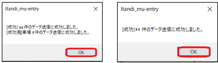 「[成功]〇件のデータ送信に成功しました。」のメッセージが表示されたら、送信処理は完了です。