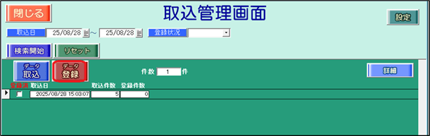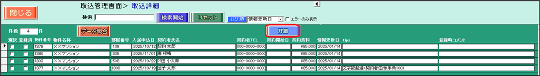 取込管理画面>取込詳細の[詳細]ボタンでデータ登録画面を開き、データ修正を行います。