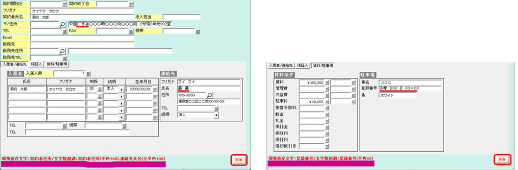 ・具体例1.環境依存文字:契約者住所/文字数超過:契約者住所(半角100),連絡先氏名(全半角100)