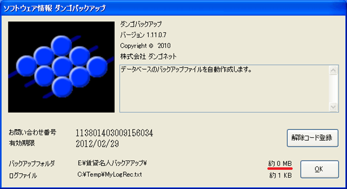 ソフトウェア情報画面の「バックアップフォルダ」欄に、「約0MB」と表示されます。