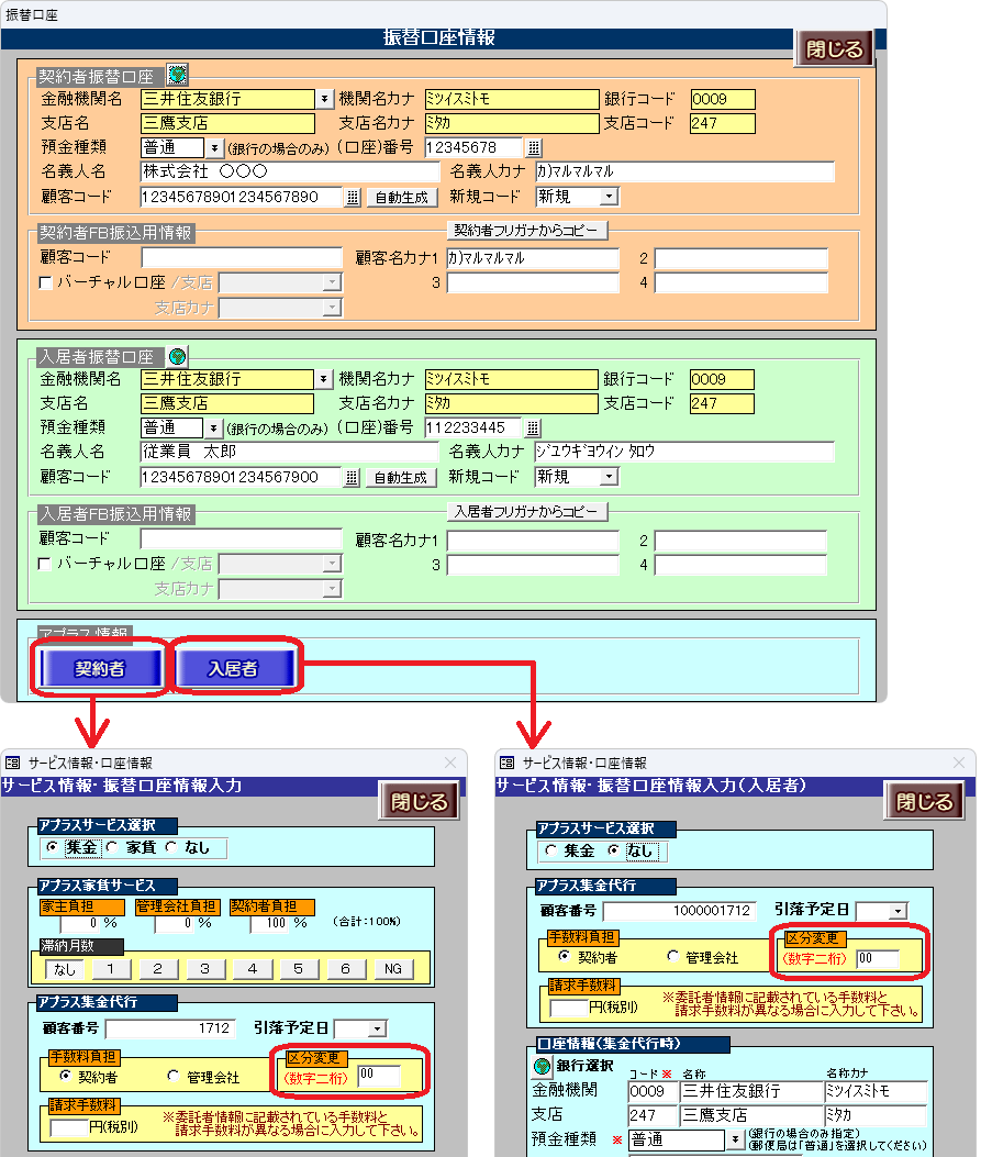 「区分変更」欄は、株式会社アプラス で事前登録した2桁の数字を入力します。 通常は「00」が指定され、賃貸名人も初期値「00」を入力支援します。 数字は手入力で変更できますが、「00」以外の区分を指定する場合は、株式会社アプラス に書面にてご通知いただく必要があります。