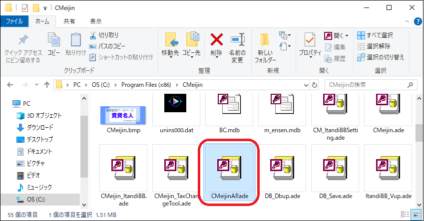 ①賃貸名人のサーバ機のインストールフォルダを開き、ファイル「CMeijinAP.ade」をコピーします。