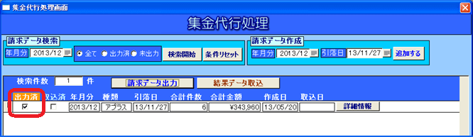 5.請求データの出力後、該当の年月分の請求データのレコードに[出力済]チェックが入ります。