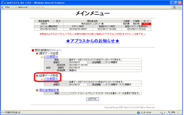 株式会社アプラスのシステムサイトにアクセス・ログインし、結果データのファイルダウンロードをします。