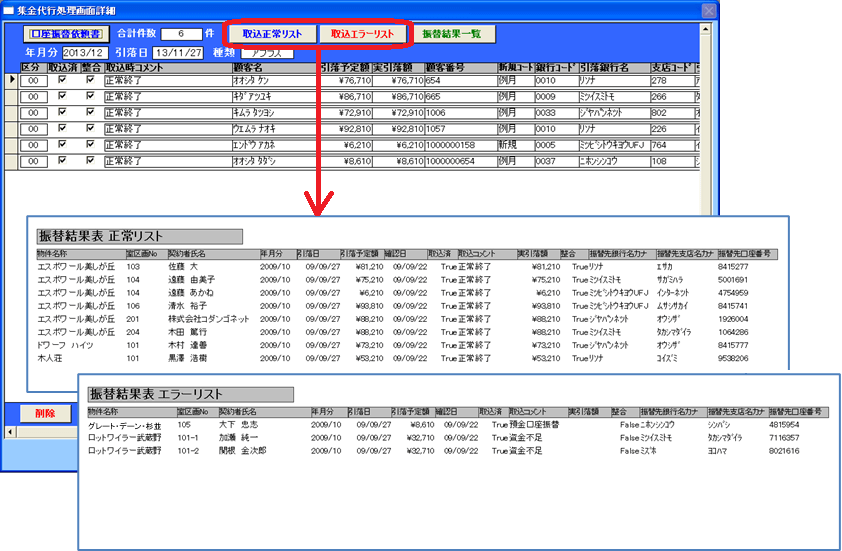 ・帳票タイトル:「振替結果 エラーリスト」 ([取込エラーリスト]ボタン)