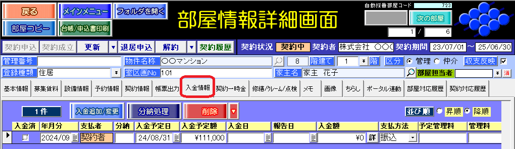 部屋情報詳細画面の[入金情報]タブで、該当月の入金レコードが存在するかご確認ください。