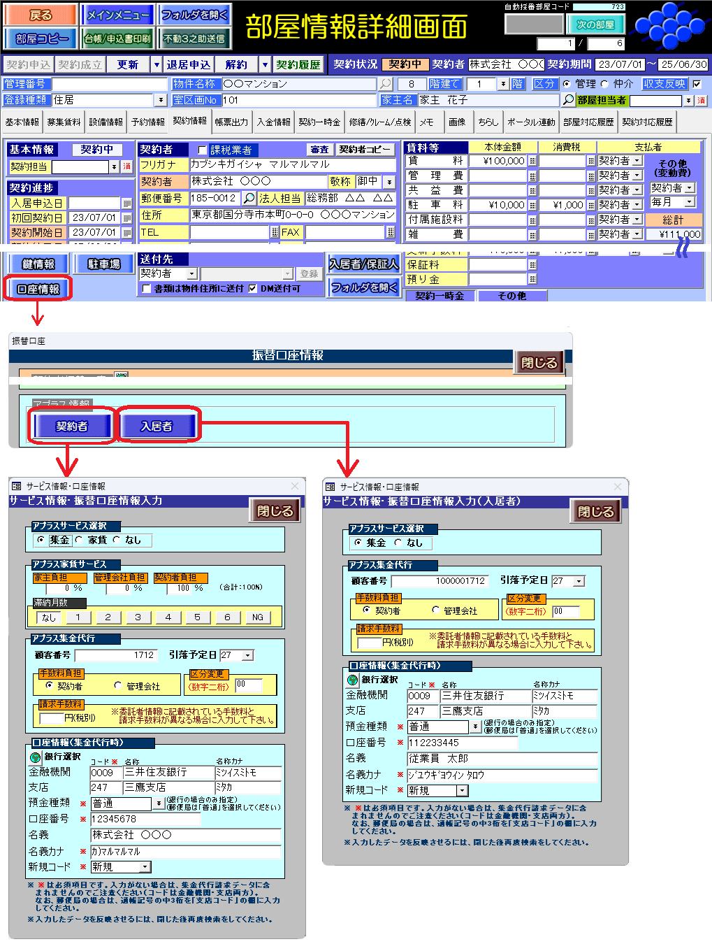 部屋情報詳細画面の[契約情報]タブの[口座情報]ボタンを押します。