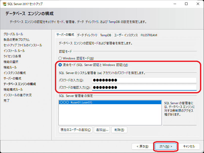 (10)「混合モード(SQL Server 認証 と Windows 認証)(M)」を選択します。