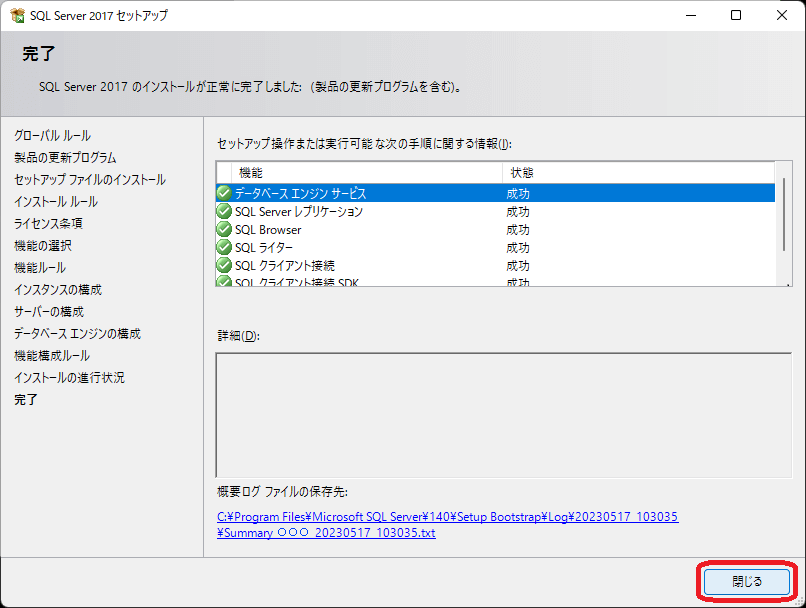 (11)[閉じる]をクリックし、SQL Server 2017のインストールを完了します。