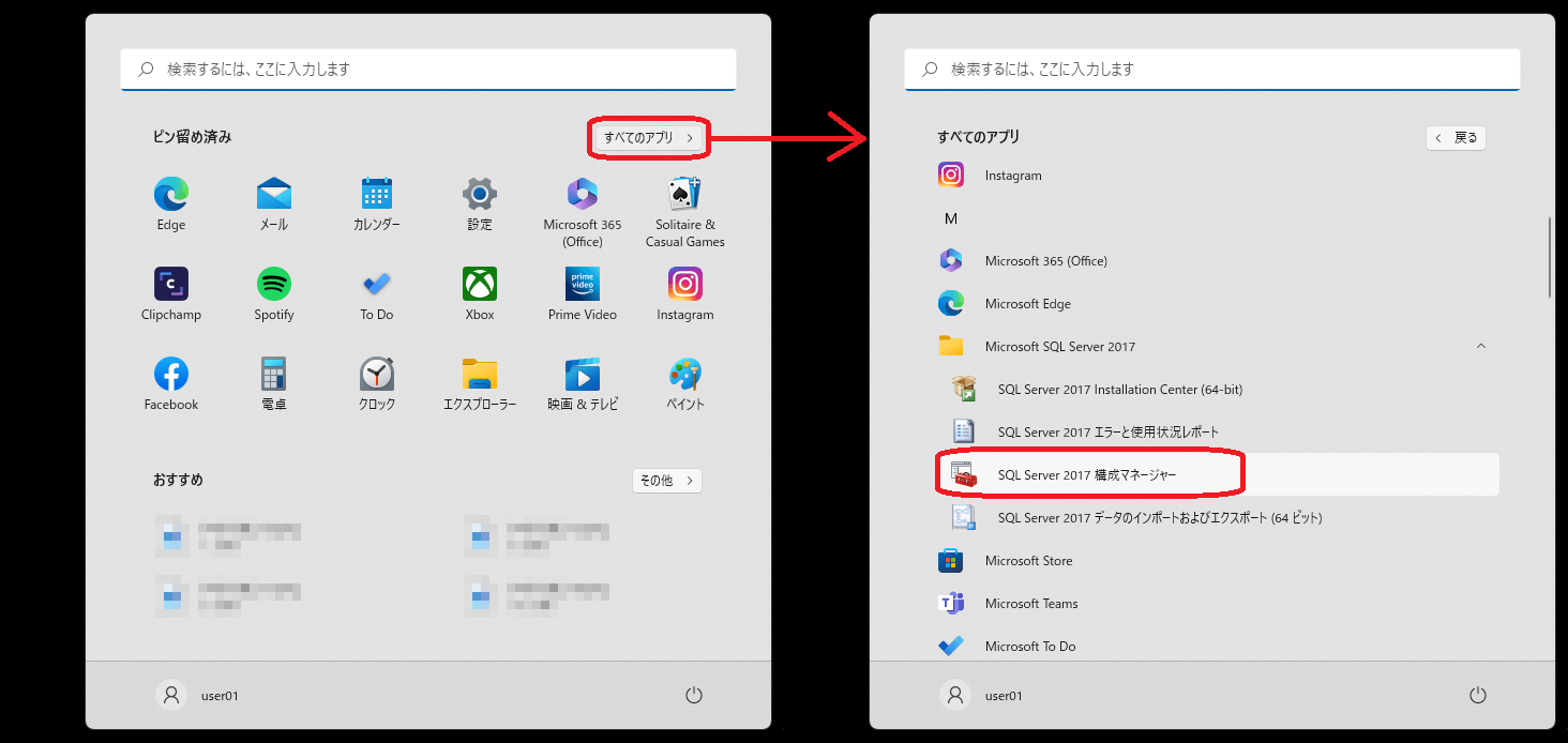 スタートの「すべてのアプリ」-「Microsoft SQL Server2017」-「SQL Server構成マネージャ」を選択します。