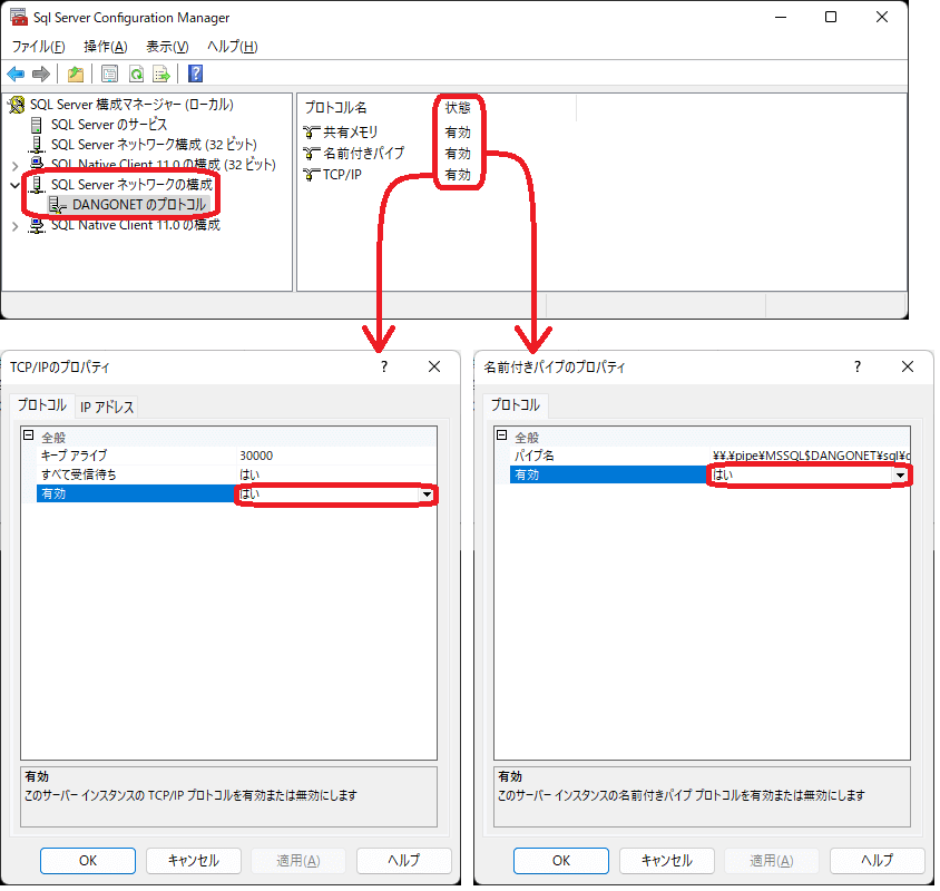 (14)「SQL Server Configuration Manager」が起動したら、左メニュー「SQL Server ネットワークの構成」の「DANGONETのプロトコル」をクリックします。「状態」欄が「無効」の場合、「有効」にします。