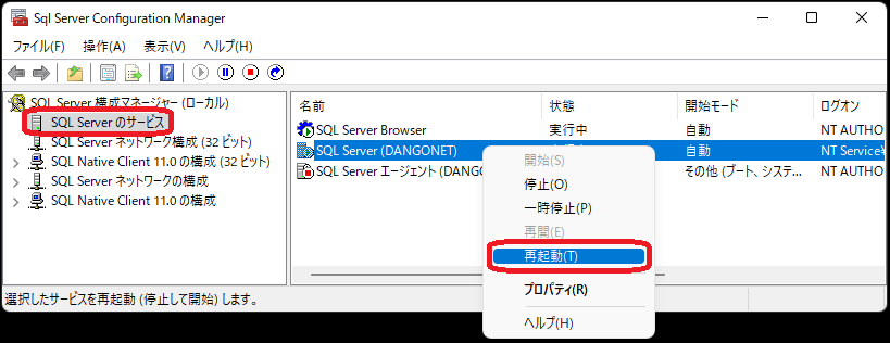 (15)設定変更後は「SQL Serverのサービス」をクリックし、「SQL Server(DANGONET)」を再起動します。