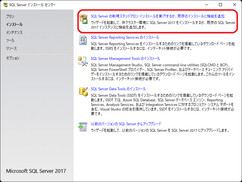 上部の「SQL Server の新規スタンドアロン インストールを実行するか、既存のインストールに機能を追加します。」を選択します。