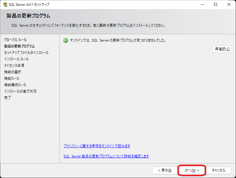 (4)「製品の更新プログラム」の[次へ(N)>]をクリックします。