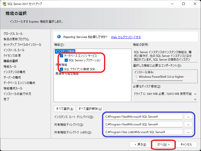 (7)次の3項目の機能にチェックを付け、[次へ(N)>]をクリックします。