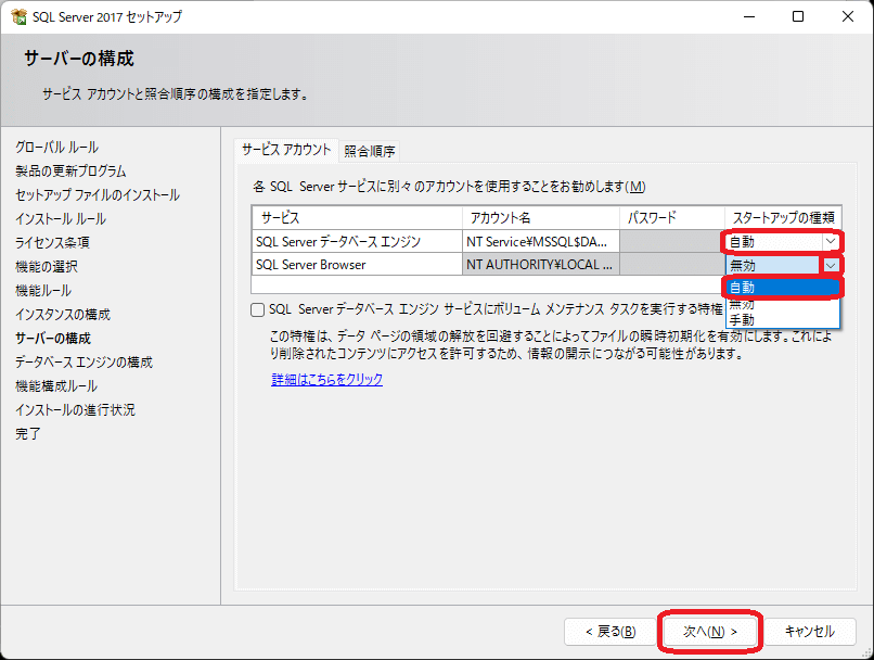 (9)以下のサービスが「無効」の場合は「自動」を選択し、[次へ(N)>]をクリックします。