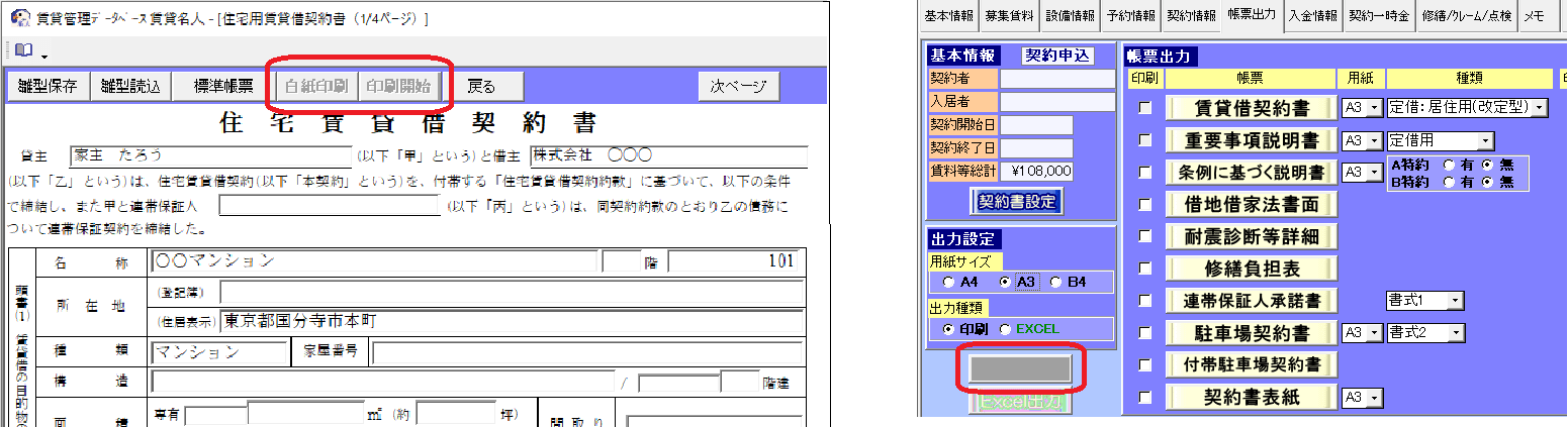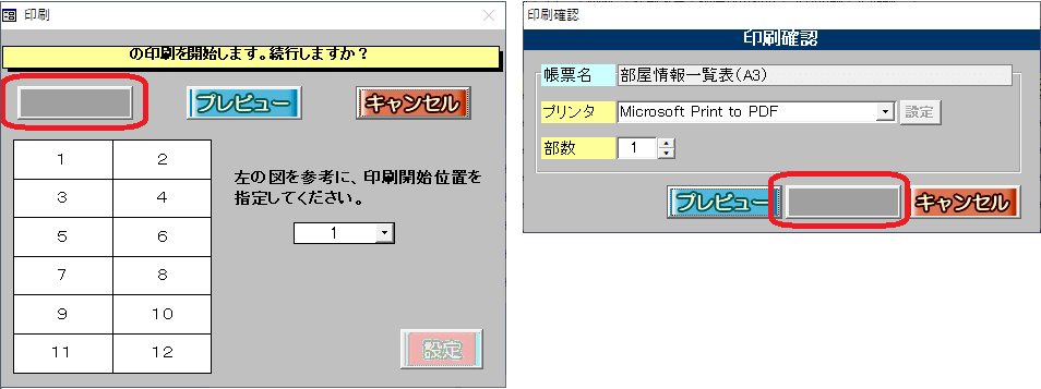 ・部屋情報詳細画面の[帳票出力]タブの印刷開始ボタン