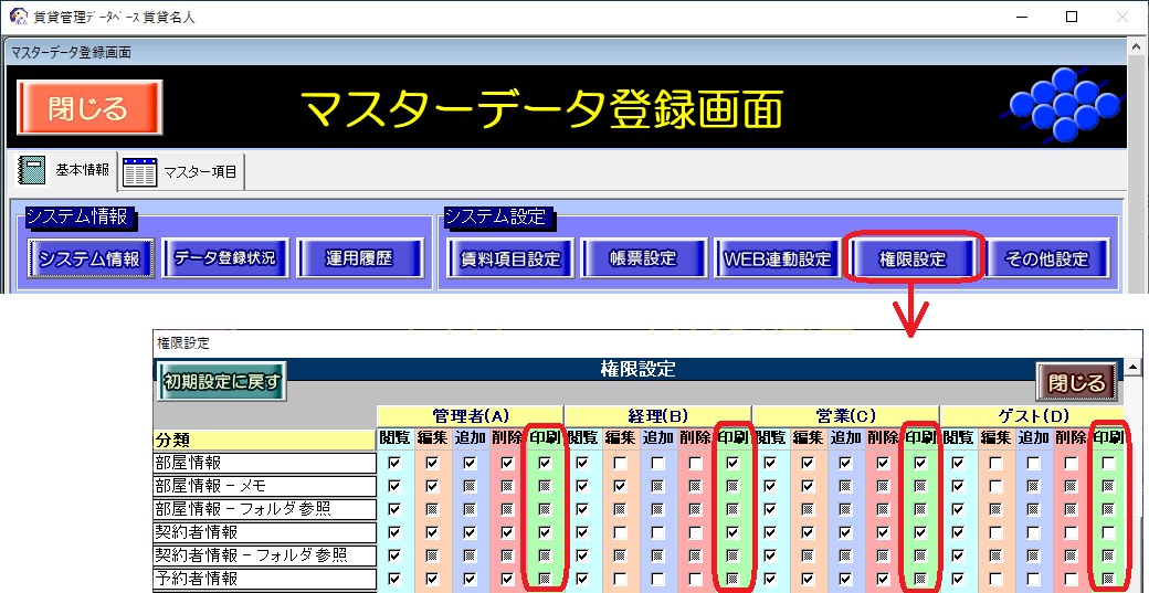 (3)マスターデータ登録画面の[権限設定]ボタンをクリックします。