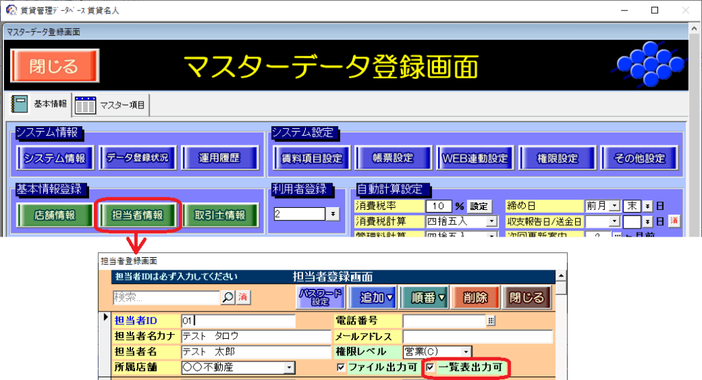 (4)担当者登録画面で該当の「担当者ID」の[一覧表出力可]チェックを付けます。