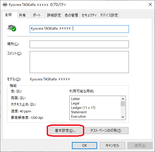 (5)[全般]タブの[基本設定(E)]ボタンをクリックすると、「印刷設定」のウインドウが表示されます。