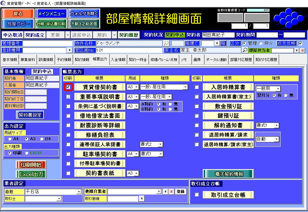 (1)部屋情報詳細画面の[帳票出力]タブを開きます。