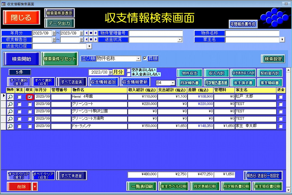 検索結果の全物件を対象に一括印刷する場合、[すべて選択(収支)]ボタンをご利用します。