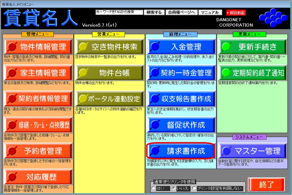 ・[家主請求書印刷]ボタン [対象:賃貸名人6.0.1以上](2023/11/01追記)