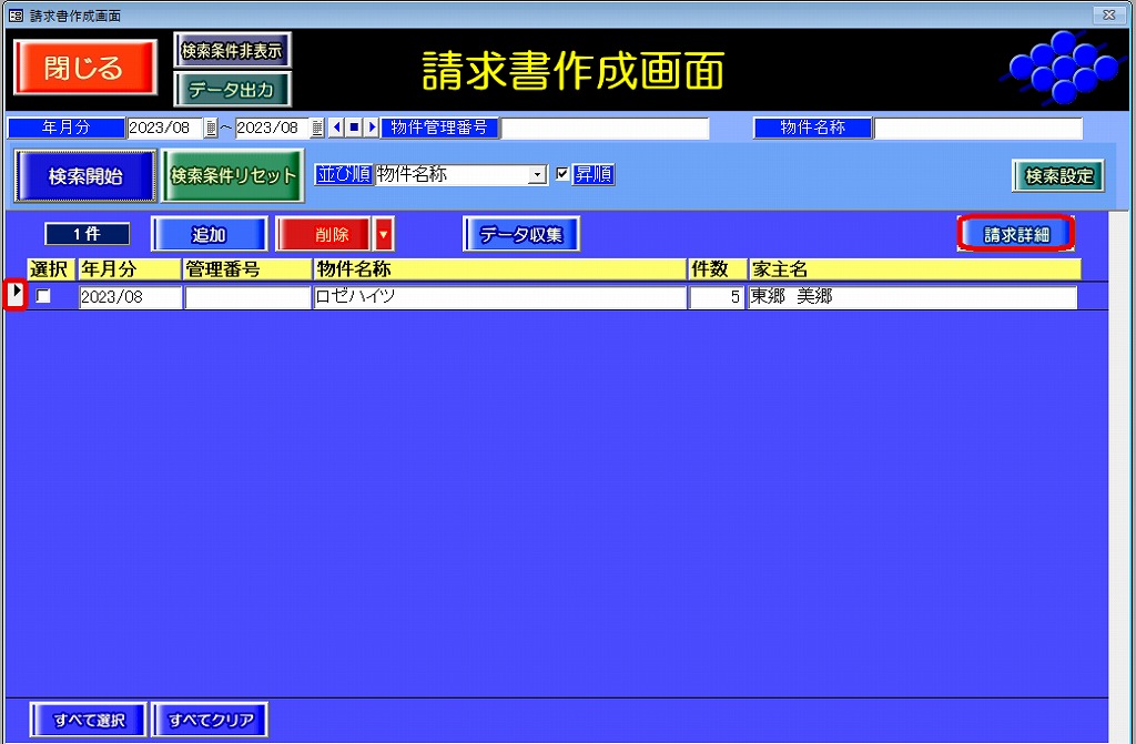 (2)請求書作成画面で該当物件にカーソルを合わせ、[請求詳細]ボタンをクリックします。