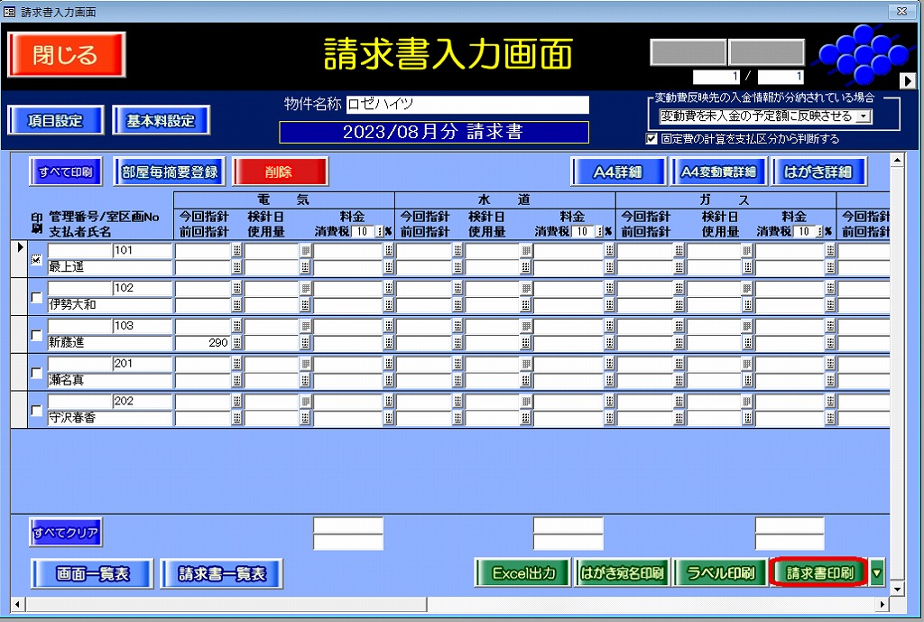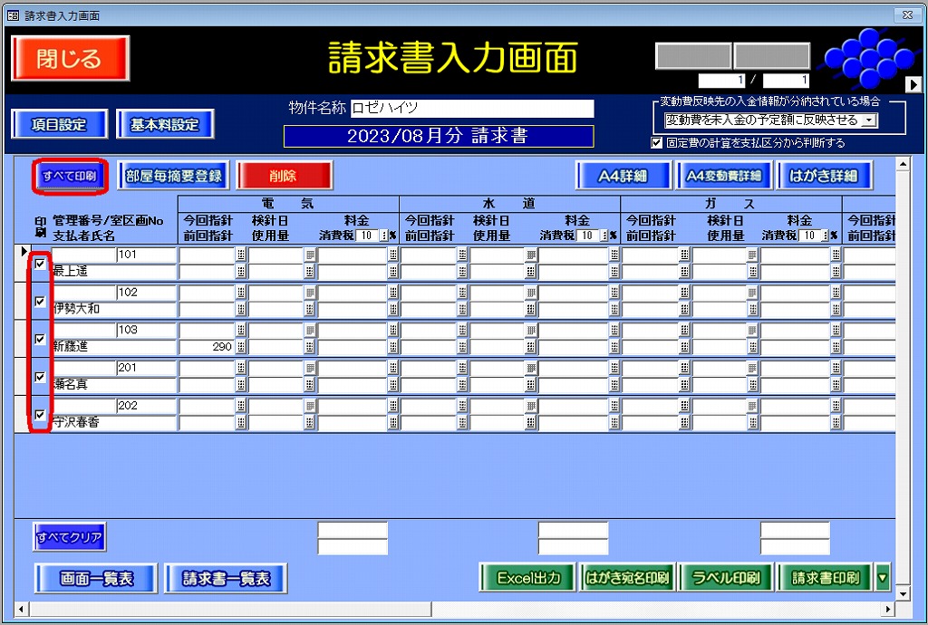(3)請求書入力画面の各物件レコードの右側 [印刷]チェックを付けます。