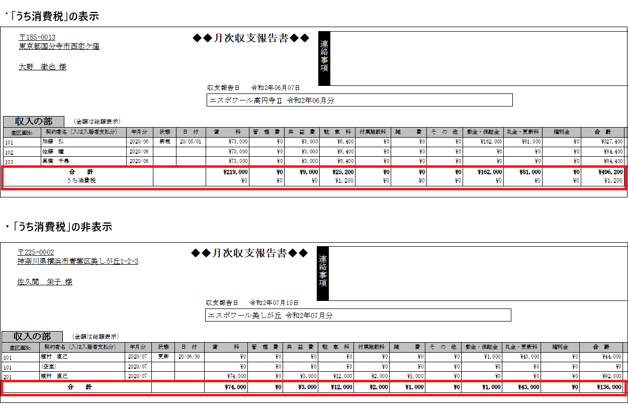 賃貸名人5.6で、月次報告書「収入の部」の合計欄は、賃料項目の税額が確認できるよう「うち消費税」を印字します。