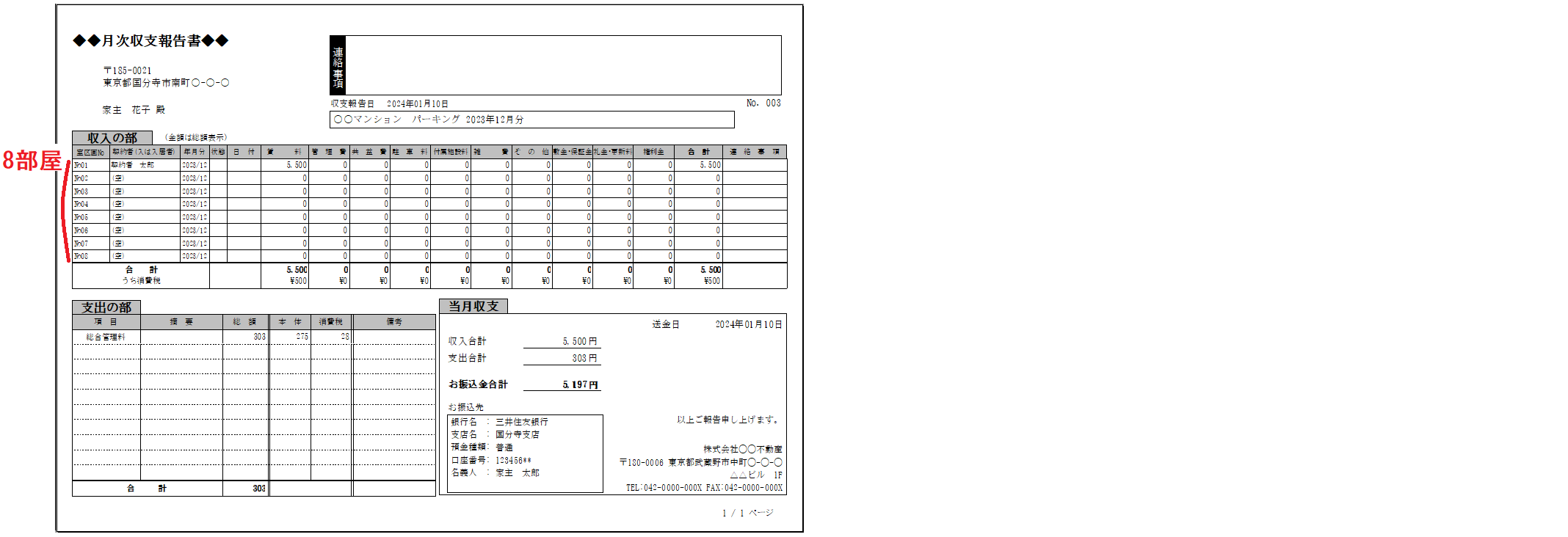 例2.月次報告書「A4」 収入の部 × 8部屋の場合